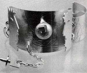 The jewelry of Christina Smith exhibited at the Texas Tech University Art Department presented a different aspect of the subject matter interesting some metalsmiths. Her bracelets and brooches with attachments of missiles, satellites, submarines and bombshelter signs would place the wearer at the center of cocktail parties, art openings or political demonstrations. The serenely designed weaponry was awesome in technical finesse, amusing in its unexpected context and guaranteed to initiate dialogues on the controversial subjects plaguing Planet Earth. Smith explained that her work "is autobiographical . . . the places I have lived, my friends . . . . My pieces are also often political and reflect the 'evening news.'"