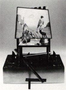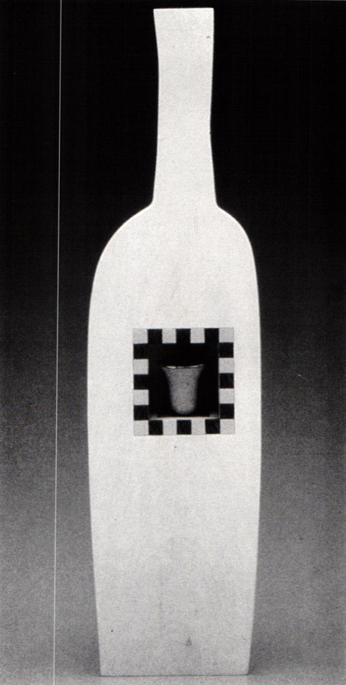 The problem of disengaging wearable items from tableaux, each called Window Rock, was the challenge offered by Mac McCall. In Seduced by Clichés, a technical tour de force, a scenic romp in a world of Lilliputian billboard art was assembled. On the billboard, a mirage of the Painted Desert with a cowboy planted in the foreground shimmered in holographic realism. A favorite symbol of the artist, a zigzag signifying snake or water, slithered across the top of the sign. Placed in front of the hologram, a table supported an array of diminutive objects including an arrow-shaped rock pierced by a spear, while a tiny bronze deer stared at the cowhand—the hunted haunting the hunter. The table legs and the supports for the billboard with its scorching landscape were anchored on a metal surface painted to resemble water from which shark's fins ominously projected. Seduced by the artist into his world of miniaturization, the spectator was left clinging to that final cliché, "between the 'hot place' and the deep blue sea," while the only means of escape was a precarious arrangement of l-beams reaching toward uncertainty.