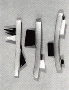 The participating artists and a sketch of their dominant methods: Tove Becken: crisp, graceful curves of black PVC with silver, niobium steel and titanium fastening accents; Millie Behrens: smooth, circular strands of colored nylon with silver structural supports for neckpieces and an armring; Liv Blavarp: laminated patterned blocks of wood, carved and sanded into simple forms, Christine Bongard: spare, circular arm rings and neckpieces in aluminum with linear black on black surface embellishment; Sigurd Bronger: a variety of materials (brass, steel, paper, gold, silver, ping-pong balls), which balance light, geometric, closed forms on linear supports; Gry Eide: colored cane, newspaper and wood in circular forms (bangles and neckpieces); Ingjerd Hanevold: mesh collars, and pleated niobium sheets formed into earrings and bracelets; Morten Kleppan: black, acrylic incised sheets fabricated into smooth, ameboid shapes with colored, geometric additions; Ingrid Larsen: long, linear bamboo pins with horizontal fiber accents: Laila Irene Olsen: sharp-edged, perforated metallic pillow forms as beads for necklaces and earrings; Heidi Sand: a variety of functions (armpieces, earrings, ear pins) and materials (silver, copper, aluminum, formica, ebony, rubber) utilizing the triangle (or cone) in suspension; Ann-Rita Bryghaug Wold: chiseled, organically shaped marble forms on thin, black, steel structures.