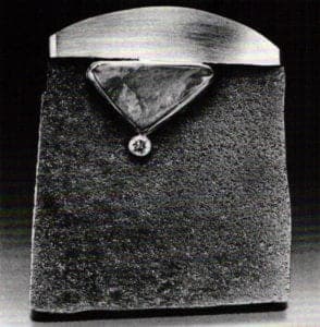 Diamonds were used in a third of the pieces in this show. A cluster of them seemed to extrude from Yves Kamioner's 18-karat gold ring. Pat Flynn joined a single diamond with an opal, steel, gold and sterling silver in a small, wonderfully complex brooch. The visual qualities and connotative values of each element were amplified as each was viewed in the context of the others: questions of preciousness, fragility, permanence, industry and luxury came to mind. Flynn's brooch was an outstanding realization of jewelry's potential to stretch thought beyond the stimulus of an esthetically pleasing object.