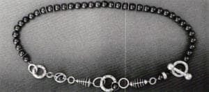In marked contrast to the Dionysian fervor of Glowacki's metal constructions, Robin Quigley drew upon a restrained historicism. Quigley has described her brooches and necklaces as "classical pieces" with origins that may be "traced far back in history." A particularly satisfying necklace by the artist was fashioned with elongated pewter beads lightly marked on the surface with a delicate calligraphy that appeared to have been rubbed with graphite.