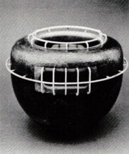 Another impressive piece was Thomas Crossnoe's pewter Bottle, which won a Purchase Award for the Permanent Collection. In this large vessel, 24 inches in diameter and 18 inches high, the indentations of the hammermarks give an elegant shimmering effect to the surface skin. An inverted shell completes the lid and small cabochons of turquoise catch the eye.