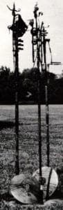 The swing from the small-scale objects to large-scale work allows for a focus on a variety of art-oriented approaches. One such approach is that of Richard L. Stauffer's innovative 10-foot-high sculpture Peasant Revolution, constructed of steel and found objects, wrapped with copper wire and copper tubing. At the base are round, painted, shieldlike objects, which add to the mystical quality and reflect a strong, primitive, totemic imagery.