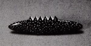 Several artists deserve special mention. Morten Kleppan's four-inch black ameboid brooches were refreshingly original. By incising the black acrylic surfaces and including primary color accents on the interior of the adjoined forms, he successfully manages to humanize his inherently cool material and evolve a form that is simultaneously playful and serious.