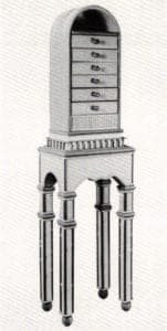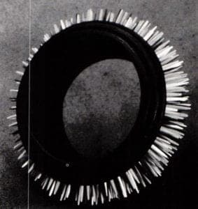 In much of his work he is testing the spectator's view of what formally constitutes jewelry. A quite mysterious ring has large chariot wheels on either side, each missing a quarter segment from its rim. When worn or turned on a surface the entire ring gyrates freely. Most intriguing, though, is the ring's center piece, not a stone or crystal, but a miniature brass treasure chest containing a sealed object. The wearer/spectator is asked to imagine a fantasy piece of jewelry within this casket.