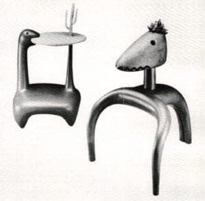 The exhibit became more noteworthy, however, when craftsmen went beyond such traditions, in pieces that integrated more fully the two materials and mediums. Materials were disguised: a hat rack by Bob Ebendorf and Jerry Kott offered provocative play with surface treatment. The dark stain on the wood structure suggested that it might actually be wrought iron; affixed to the rack were beads wrapped in Japanese newspaper, glitter, glass and stones. Two pieces by Judy Kensley McKie and Jonathan Bonner also focused on surface and texture. The mahogany body of Arizona had been painted and polished in a milk paint to coppery sheen, while the base of Chive Head was stained a deep green to evoke a surface patina. Wood and metal playfully impersonated one another.