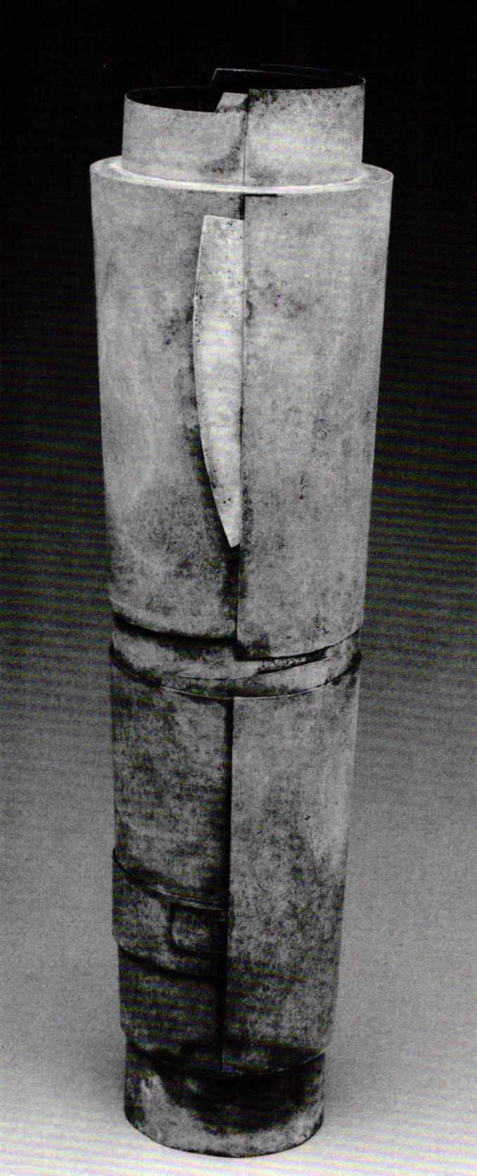 Claire Sanford's tall, patinated, cylindrical vases have a fragile, airy presence, almost intuitive in execution. Only the edges indicate that these green, powdery, opaque vessels are made from metal. Sanford approaches her work from a Cubist perspective, working in a planar way, often fracturing her cylinders and decorating them abstractly. Fin, nearly two-feet tall, is a poetic, volumetric collage. The work is spacious and meditative, inviting the viewer to ponder its meaning. Individual pieces are elegant, but the series offers little variation from one piece to another. Although the vase form lends itself to a variety of interpretations, ultimately it seems gratuitous. These pieces, which are too large and top-heavy to be used, have the last vestiges of functionality in the form of meager openings that appear at the top. I find them unnecessary, as the work is decidedly sculptural.