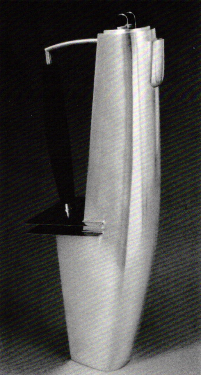 A flawless ability and thorough understanding of the materials are strong proponents in the functional forms of Memory Container by M. Avigail Upin and the Tea Service by Michael and Maureen Banner. Upin's brushed silver with gold inlays is a tightly controlled abstract design, The curvilinear shape is juxtaposed with sharp geometric forms, creating an asymmetrical design. The Banners' tea service is elegant and stylized. The graceful shape of the pieces as well as the sleek, highly polished surfaces create a sensuousness in sharp contrast with the dark wooden handles. With the increasing cost of precious metals, it is impressive to see large pieces created in silver.