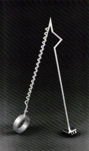 The major work in the exhibition, a mirror fabricated to sterling and plastic, presents itself as a dialogue of materials and construction. In other pieces, the organization of similar formal elements and the establishment of systems for these elements carries on the dialectic. In Complements, a sterling and plastic brooch, these elements and the systems of their organization are simultaneously analyzed within each side of the piece. Basic formal elements on each end of the brooch are bridged to a restructured version of these elements on the opposing ends.