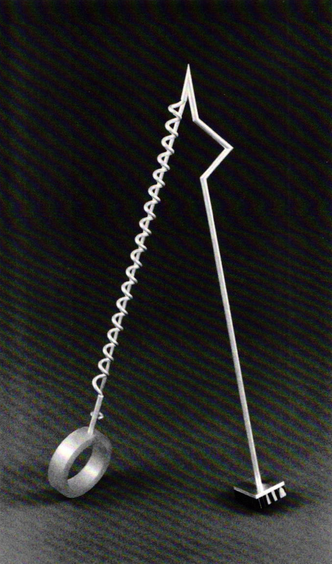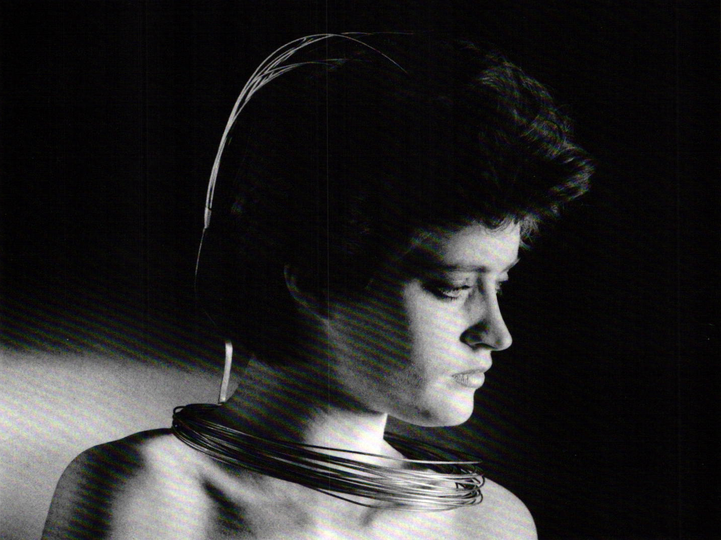 Although Chan's wearable objects, at least in a Western sense, stretch the boundaries of ornamentation, there are other examples from Betty Walton, Kye-yeon Son and Jackie Anderson—that also reflect on how jewelry is seen and worn. With Walton, the shoulder is used to support a contoured metal brooch, while, in another piece, the back of the head is beautifully accented with a fountainlike spray of metal threads. As for Kye-yeon Son, her stickpins find two places of habitation, on the body and in plastic stands that evoke a sense of serene landscape. Some of Jackie Anderson's brooches and earrings also have a duality of purpose—belonging not only on the figure but also on flat surfaces as objects d'art. Anderson's jewelry is based on commercial signs whose visual elements have been appropriated and reworked into a quirky pastiche of forms and colors. They contain strong echoes of architecture and design, ranging from the elegant gestures of Art Deco to the tackiness of 50s neon.