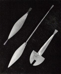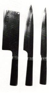 In Oriental Kitchen Set (1985), Baldwin has used the mokume process on brass and copper to create a wood grained pattern in the blade's of the cleaver and two knives. Each blade pattern is different and the three are held to a relationship by similarity of the handles.