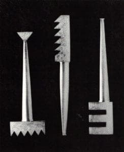 Both groups of work rely on the assumed dignity of the work ethic and its implied value system. A sign in the gallery reads, "Please do not touch the metalworks." Within the context of this exhibition, this ironic removal to the art gallery is exaggerated. The simple tools of farming and industry are arrested from motion, fixed within the art object.
