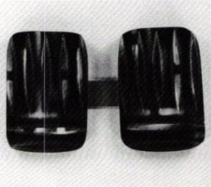 The juxtaposition of the irresistible patina, the gently swollen curves of the simple forms, the accentuating gold spines and especially the restrained yet theatrical size of the pieces commend the fresh quality of Enterline's work. Her simplicity does not preclude expressiveness. Enterline's jewelry has emotional power, of an archaic, theatrical presence, with antecedents in ceremonial jewelry and the shiny, crisp profiles of modern tools and equipment.