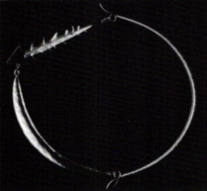 The signs of a superb technician are present throughout all the jewelry, but the artist in Jaworski emerges in the neckpieces. These pieces literally vibrate with a serene, naive resonance. In an effort to hide latches and various engineering elements within the junction of collars and pendants, Jaworski unwittingly breathes life into these neckpieces. The intersections resemble twiglike boundaries appointed with an exquisitely sensitive touch. This flourish lends primal quality to the work. Additionally, these pieces possess the spiritual punch of a pure, sterling white surface. The strong, unwavering line quality reveals the inner confidence, and sensitive nature of the maker.