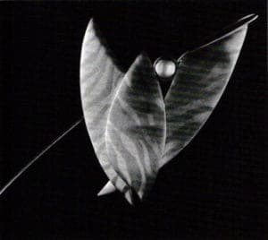Spectral Fragments, being more controlled, is less successful. It too features bronze and glass perched atop a black marble base. This piece incorporates an electric light source that illuminates the glass from within. The hollow bronze resembles petals and yields a static visual effect. Jaworski is more effective when he explores movement and is most effective when he allows the viewer a glimpse of his essential nature.