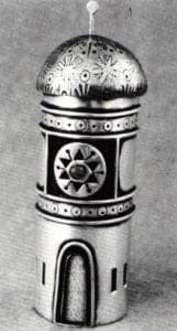 A small Havdalah spice container by Bernard Bernstein consists of a rosewood foot suggestive of the base of a chesspiece, and a tuliplike top of folded and textured silver. Its cross-sectional profile is that of a six-pointed star. The base of the tulip curves inward like the flower itself, and its would-be calyx consists of negative space that also forms a six-pointed star. Within the flowerlike head is a spice receptacle topped with a small crown made of pierced Hebrew lettering that is its cover. The meaning of Havdalah is "separation," implying the termination of the holy day (Sabbath) and the beginning of the secular week. The two materials used within this piece, rosewood and silver, also express this separation in a unified way, with a matching of scale, a matching of curves.