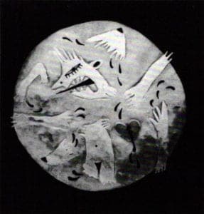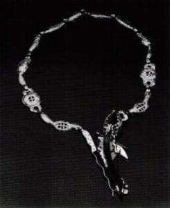 Ulrika Johansen's Sad Monsters, Heart Eater, Devourer, Polecat's Teeth, Big Mouth, Eye, Snake and Mermaid are pieces that suggest a demonic world view, though allegorical, humorous and androgynous in flavor. The media used are silver, copper, garnet and dabs of epoxy paint and acrylic. Most of her pieces are created with repousséd peapod shapes, showing a strong balance of positive and negative contrasts. They are flat and in low relief, with arrows and spears piercing anatomical details of the combined figures of females and males, The most interesting piece is Devourer, a necklace made with two large pins that can be draped on the shoulders without going around to the back of the neck. Like primitive Eyptian, African and Scythian shoulder pieces, they are wide and cover a large part of the torso. These figures are moveable and connected with simple chased and repousséd pillow forms. The hedonistic creatures are trying to eat and bite one another, with dangling garnets signifying blood. The theme is the game of eating, being eaten or devouring and biting into the heart.