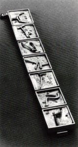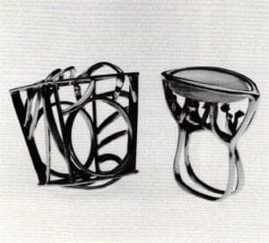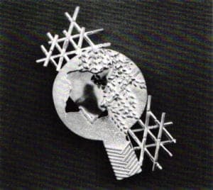 In addition to all the above, Arentzen displayed four prize-winning pieces, a selection of designs made for manufacture and part of a designer collection for Aiwa, Tokyo. She also introduced her new series of Door designs—mostly pins, except for a couple of pendants—which are not as abstract as are her other pieces in this rich panorama of her distinguished work.