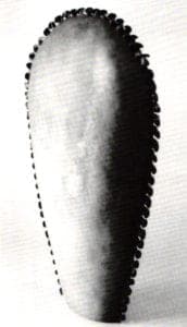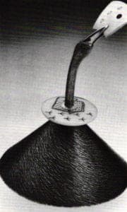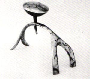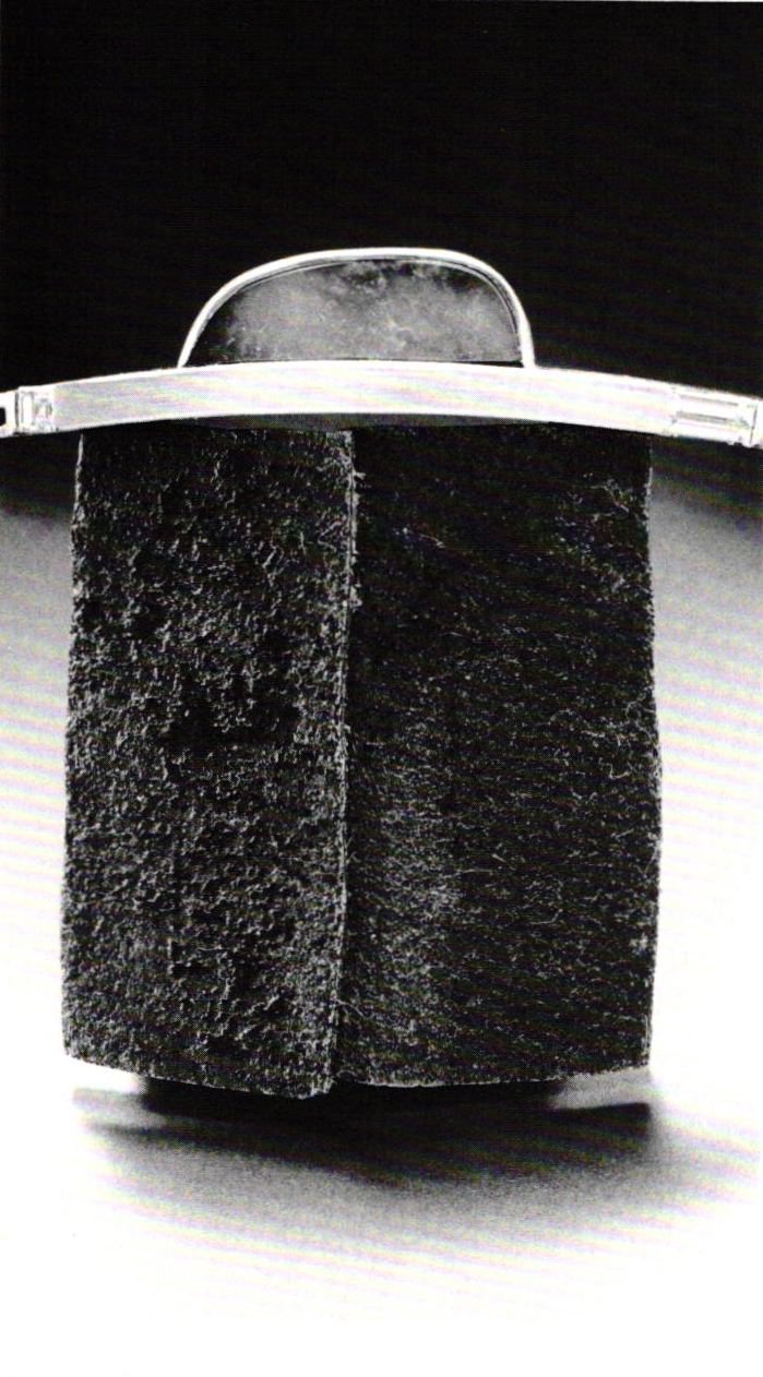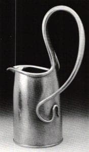 Fred Fenster continues his masterful handling of holloware in pewter with a dramatic creamer in which restrained tendril obediently follows the contoured lip edge before it sensuously whiplashes into a highly energized handle. In the table piece, Fetish for a Teacher, Barbara Grinberg achieves a richly patined surface that metaphorically suggests ancient wisdom contained within a central, enclosed dome. Emanating from the core are conduits from which strings of beads, in varying hues of turquoise stream forth suggesting a fountain of knowledge.