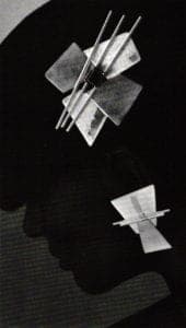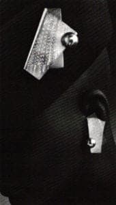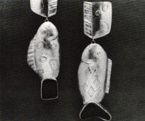 Of all his pieces, this icon serves most effectively on the brooches. Here, against the background of a garment, the juxtaposition of a variety of metals, the differing shapes and the delicate details of each piece is dramatized. The brooches are also noteworthy for their latches, which are ingeniously and compatibly incorporated into the ornamentation. Another welcome feature is that each brooch comes with a small but sophisticated lucite stand that serves to display it when not being worn.