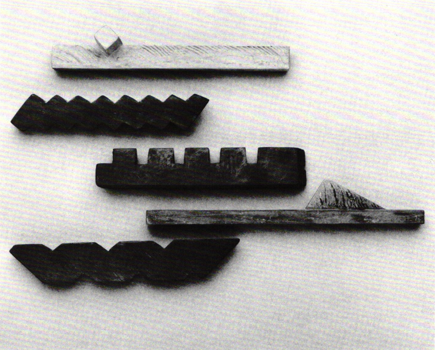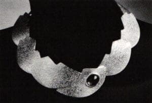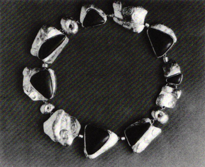 Yvonne Arritt's elegantly twisted silver band swirls around the neck of its wearer suggesting a metallic scarf. A roll-printed pattern of loosely woven gauze on one side creates a subtle but rich textural contrast to the reverse side of this highly polished and crisply articulated sterling collar. Using the unconventional jewelry materials of wood and acrylic paint, Betty Heald's series of Object Pins are considerably more successful when seen as a group than when separated into individual pieces.