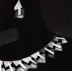 Continuing with the bisected circle as a motif, Gretchen Raber's Necklace 62087 is a superb example of her exquisitely complex design sensibilities combined with matchless craftsmanship. The several pierced and superimposed layering of diagonally intersecting lines result in continuously shifting moiré patterns that provide infinite visual delights.