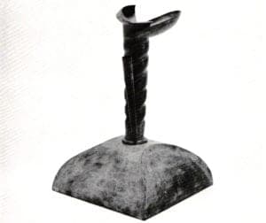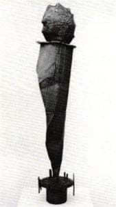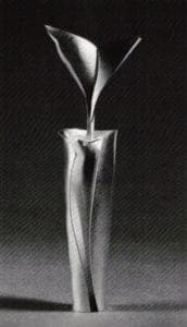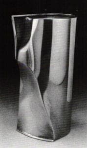 In Didur's work, geometry is still the esthetic solution, and harmonious proportions are still a philosophic goal. However, the idea of three-dimensionality alone does not dominate the work. Surfaces are given considerable attention with the use of patination and occasional applied material to create soft coloration and subtle pattern. They exude warmth, though the forms themselves are cooly ceremonious. The relationship of the two-dimensional surface to the three-dimensional figure is that of a dichotomy in which cerebral and sensual elements are mixed. The resulting objects are at once sumptuous, succinct and defined.