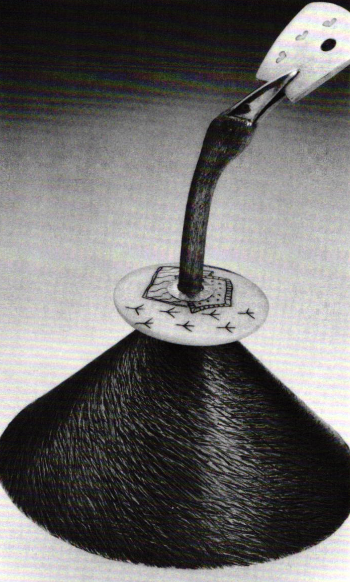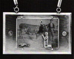 Many artists made a small-scale tableaux to explore issues of humanness and humaneness, The Sport by Carolyn Dunn was a disturbing portrait, in the form of a trophy, of everyman's values, lineage and legacy. Bruce Metcalf enlarged scale for striking effect in his African Adornment pendant, a seven-and one-half inch square replica of a 35mm slide, hung from a camera strap. Metcalf completed the camera reference with photorealistic depiction, in metal, of a native African woman. Beautiful, but certainly uncomfortable to wear, it posed some uncomfortable questions about exploitation and the taking of images, symbols, even people, out of the cultures in which they have meaning.