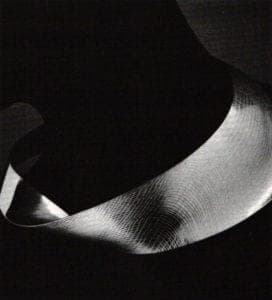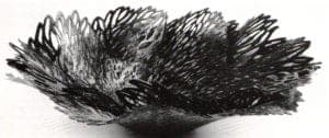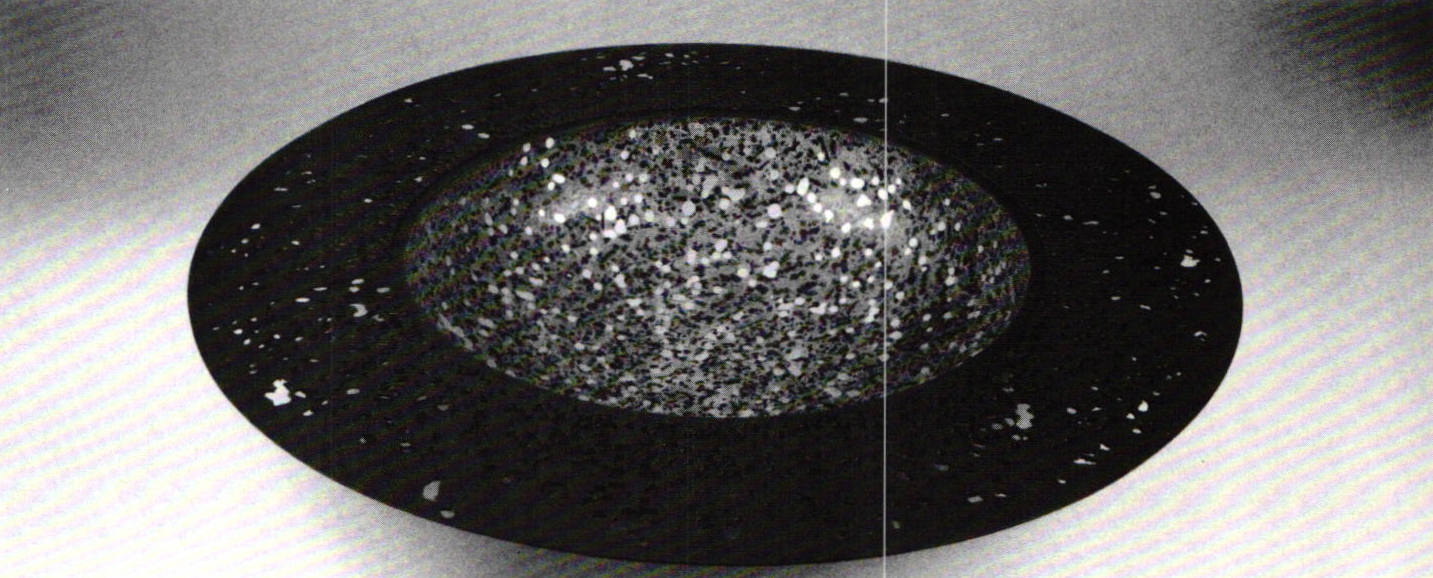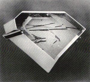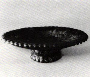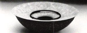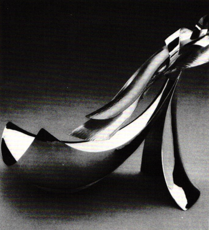 Helen Shirk's Black Tapestry, a moveable vessel-within-a-vessel, captured light motifs on its surfaces and through the intersecting lacunae of each bowl to make variable patina effects. Shirk also presented large shallow bowls rimmed by wide, horizontal flanges that engaged the surrounding space. All were patinaed with sprinkled or splashed designs. Small and enlarged versions of similar pattern and color, one on the flange, the other in or on the bowl, involved the eye in visual conversation.