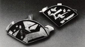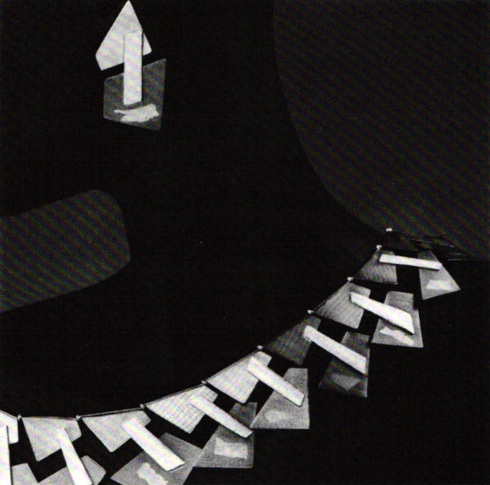 A year's residence in Wisconsin, with its ice storms and frozen fields reflected in spectacular sunsets, inspired Komelia O'Kim to produce her strongest jewelry pieces thus far. O'Kim's pins Fanfare #1 and #2 show freely placed silver and gold fragments on a dramatically dark background. These fragments extend beyond the retrictive border of her fan shapes to suggest the powerful, expanding forces of ice in motion.