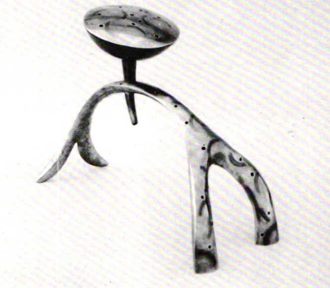 Schwarz's pewter containers are probably the least successful of his work. The containers themselves are candy-dish sized, three of the four having a reference to lids that do not operate as such. Affixed to two of these lids are, again, bird's heads, but the other two have a refreshing "mad dog-head" variation. Awkwardly sitting underneath each "lid" for balance is either a copper cone or a scrimshawed micarta knife. The pewter itself is textured, perhaps by roll printing, and covered with enigmatic symbols, scratches and bird markings. Esthetically their shapes and decoration leave something to be desired. But worse, I would be hard pressed to know how to use these expensive containers that would not trivialize them, Hair pins? Candy? Paper clips?