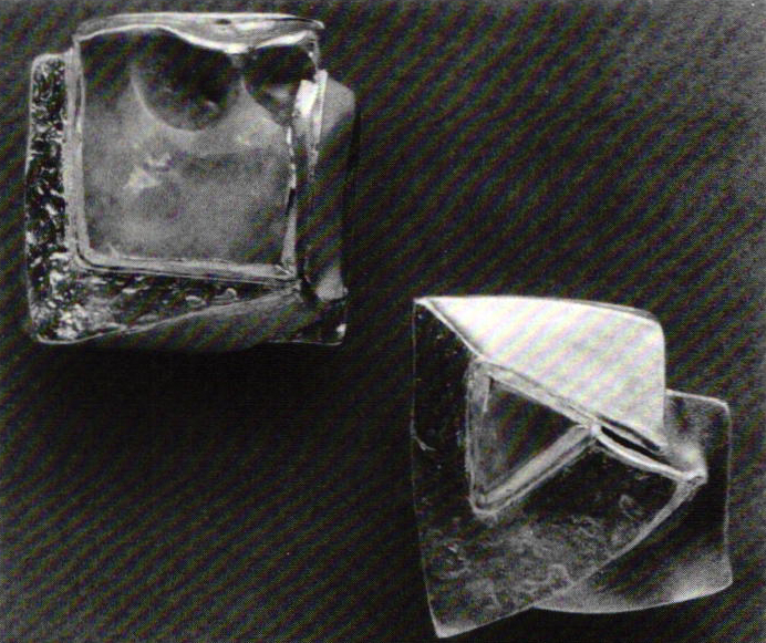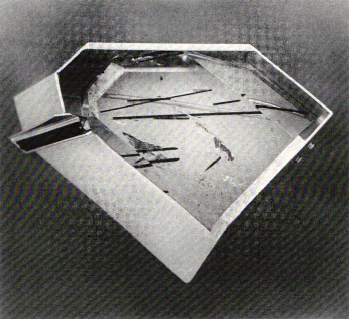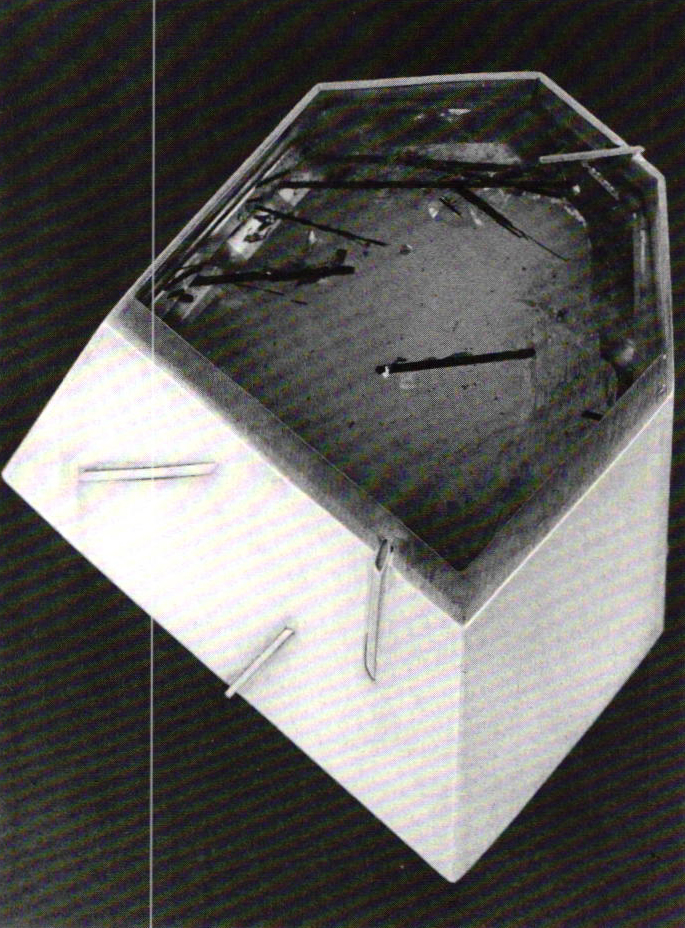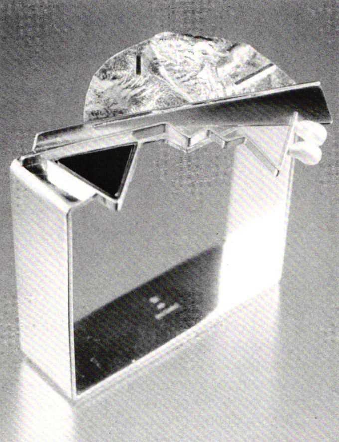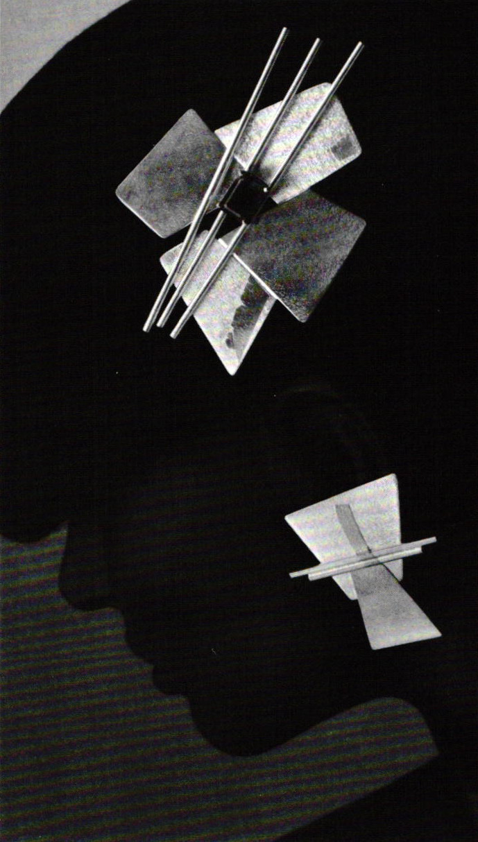 This observer sees this work as miniature sculpture. The display here clipped the brooches—for that is what Moty calls them—to plexiglass panels held diagonally within plexiglass boxes. The light streamed through the near-colorless quartz, dramatizing the all-important rods, and caused the metallic surfaces to glow. It would seem that the effect would be lessened if the quartz were set against something opaque, or forced to conform to anything other than some idealized well-lit space.