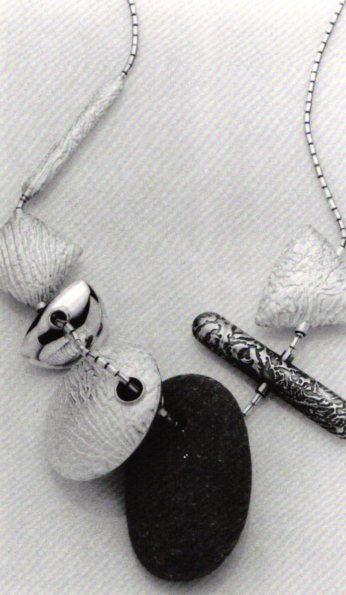 For example, jewelry often holds gems and, as necklace, bracelet, or ring, contains parts of the human body. Three of the four featured jewelers chose geometric design units. All used metal and other materials for their nonfigurative wearable jewelry. In Erosion Series Brooch. Donald Friedlich inverted the usual format of metal-holding-gemstone by setting a gold triangle as gem in an agate matrix. His strategic removal of material released the stone's inherent patterns and translucence. Jane Groover's rings and bracelets of silver and gold were precise and focused constructs, their high polish and refined settings accented by pearls, stones and reticulated areas. In contrast, muted angularity and patterned surfaces distinguished Jan Yager's necklaces of hollow, puffed ovoids, triangles and rectangles; these elements, unlike but compatible, functioned in harmonious interdependency.
