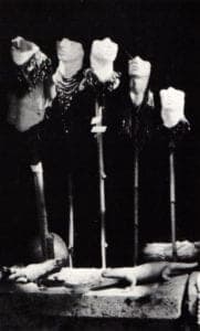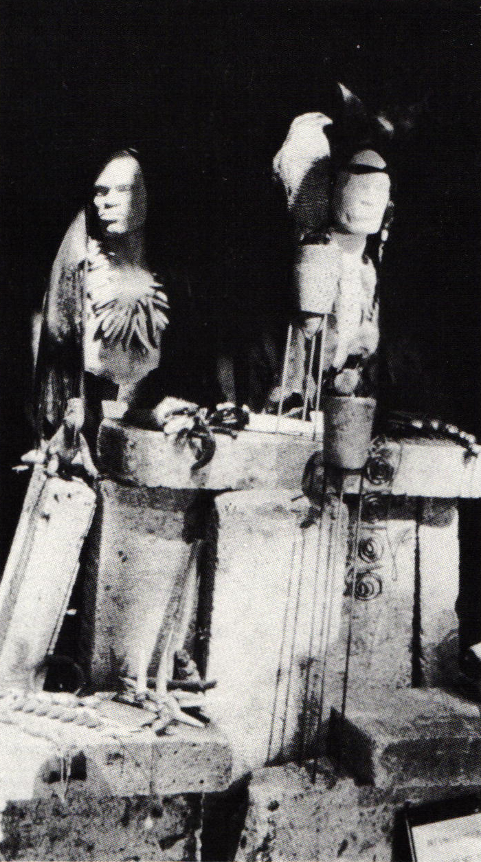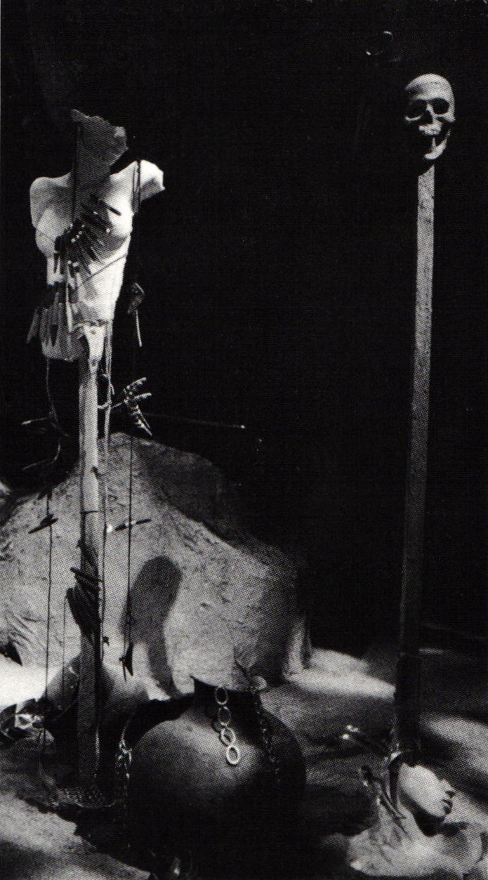Finally the persevering visitor arrived in a large, treasure-filled cave. In a circle stood muselike maidens made of plaster cast heads and torsos, dressed in an eclectic collection of jewelry, from primitive beads to elegant sculptural forms. Large, three-foot-high containers, tilted on their sides, overflowed with Morris's bronze and gold electroplated jewelry. Guarding the muses were numerous skulls and images of snakes arrayed on the sand-covered floor, while in the background massive boulders had been formed from fabric. An eerie mist pervaded the cave, caused by dry ice rising from strategically placed urns. This combination of opulence and the macabre, primitiveness and sophistication clearly spoke of the various elements of the human spirit.