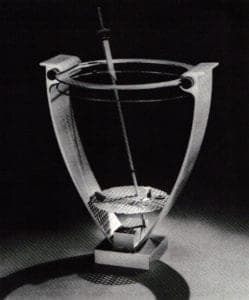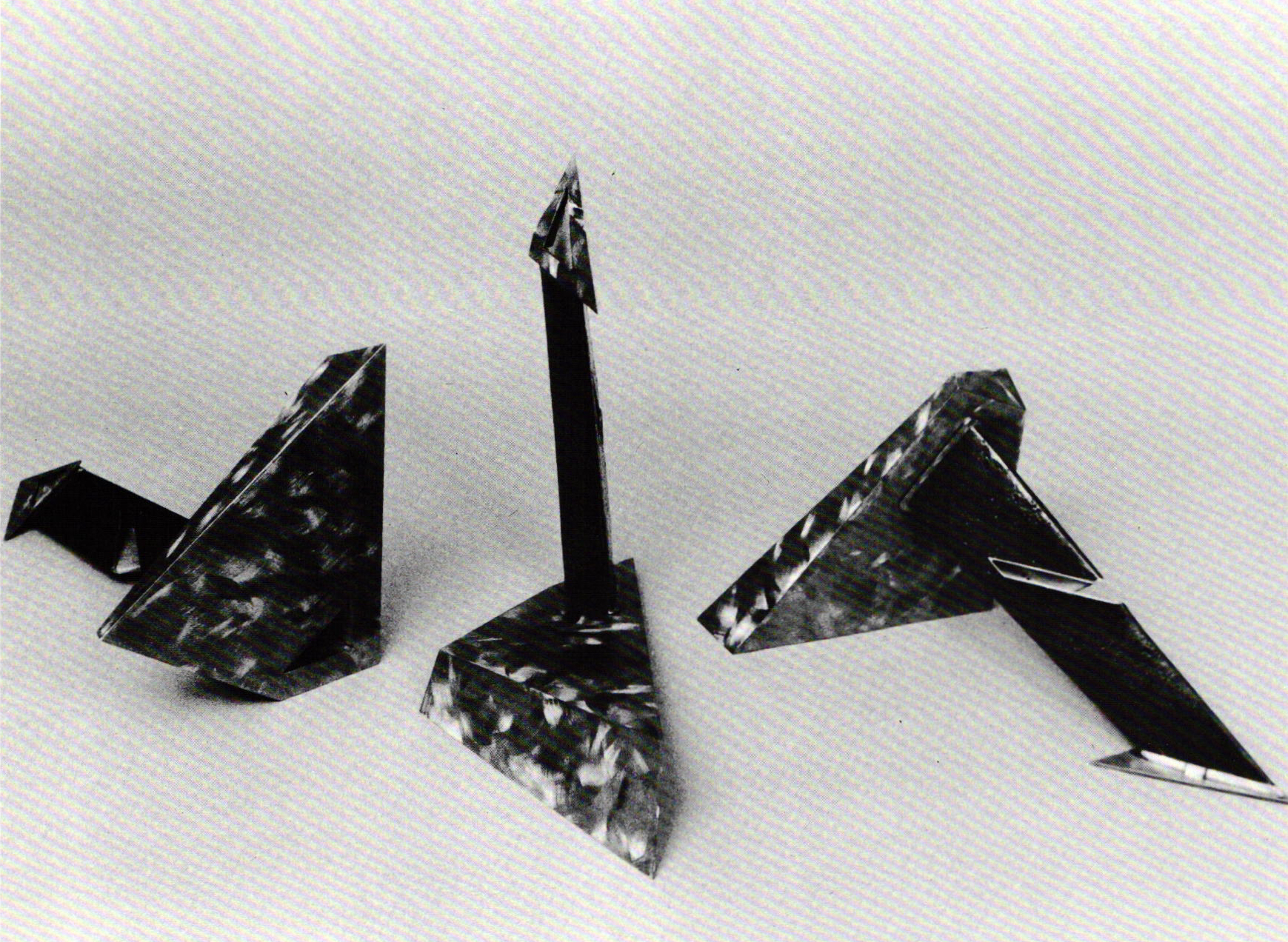 Susan Hamlet's jewelry and holloware sharply contrasted with the accompanying exhibit of colorful oil paintings on view in the same gallery. Her rigorously precise pieces have the "high tech" look and the technology of a disciplined craftsman. Many of her pieces incorporate found objects from industry, all polished to a mirror finish. The sleek reflective surfaces reveal her interest in strength and energy in the assembled and constructed works. The combined use of precious metals, gemstones, stainless steel, plastics and rubber allow Hamlet a wide range of media to create her tightly controlled geometric designs. The objects range in size from small, square gold rings to 18″-high holloware.
