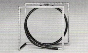Hamlet is known for her flexible round neckpieces of stainless steel wire held in place by notched silver spacers. The spacers keep the wires separated into a light and airy, hollow, cylindrical design. Clasps are created by forces of tension and compression.