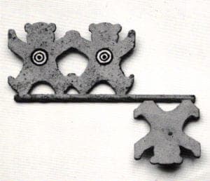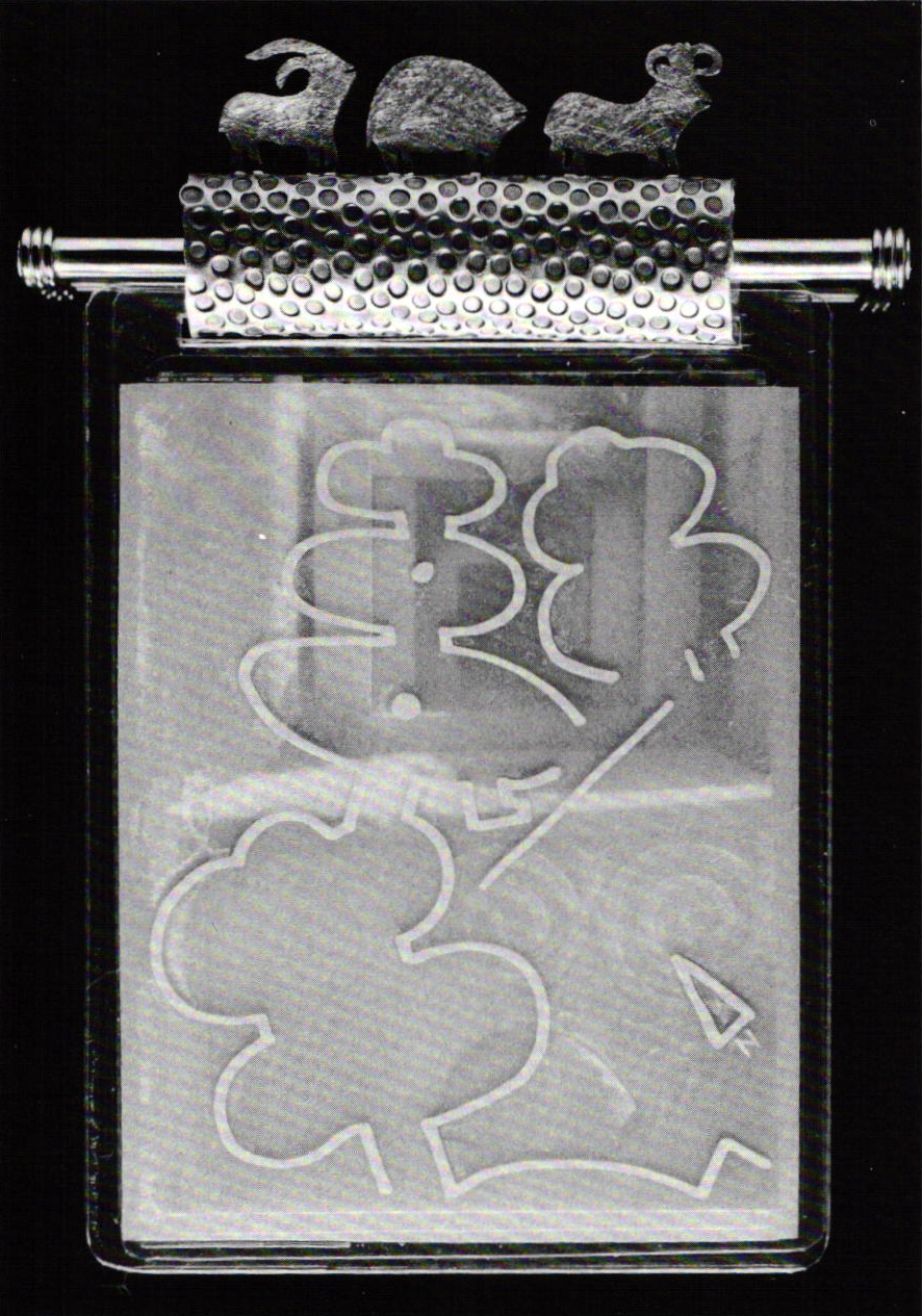 Visually, my favorite piece is Tarxian Altar Decal, a pin of sterling silver, 14k gold, laminated photo, laminated film, gouache and colored pencil. The piece functions on many levels: initially, we are drawn to the strong shape with its animal silhouettes perched on top. (How many times have we been told to "look at the cows" out the window on a long drive?) The textured fold of metal upon which they pasture draws our eye to something delightful, yet perplexing. Upon first glance, it looks like hieroglyphics, then it becomes an aerial view of an architectural landscape. Peering into the piece, we begin to make out an ancient altar and beyond it doorways that create a tunnel leading into darkness. Glenny has obscured the photograph. By the time we realize what we are seeing, we are already standing in the tomb. The viewer becomes an archaeologist, unfolding the layers of the pin to its ultimate revelation.