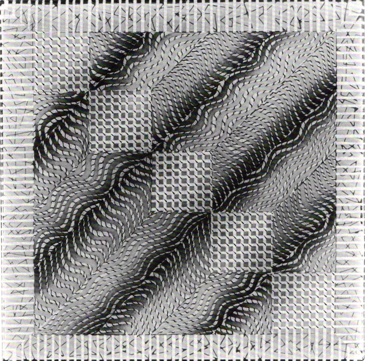 De Wolf's violent demeanor, which is not destructive but therapeutic, derives as much from her response to material as to her psychic method. She has found her nature of expression in the humble materials of wood and fiber, as Pollock found his lifeblood in paint. Her investigation of tribal textiles is apparently a search for a primitive base for material sensibility, a regression to the childhood riches of rags and crayons, free from the barriers of virtuosity. In face, she has reversed the traditional propriety of materials where wood is used for structure and cloth for covering. Her wood slats are floating planes held together by a network of expressive fiber-lines, a peripatetic contrivance of surface depth in planar dimension. Her palette, though haphazardly applied in swashes and dabs, daringly explores an emotional range, from somber black to saccharine pastels, the tonal effect of which combines successfully with the images of random planes and the movement of line to form crude, almost naïve compositions. They are meant to be raw and unfinished so as not to overcome or misuse the primitive material but to allow them to react to the method of emotional fabrication.