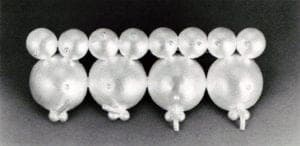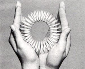 The silver and tombac, single rings, two-finger rings, earrings and bracelets reveal a fascination with the interact on of opposites and with minimal variations on a fundamentally simple theme: the male/female relationship. In some cases the tension is resolved partially in the work itself while in others resolution lies in the interaction of the human body with the object. The Silver Tubing Rings tend to need the body-object interaction in order to come into their own completely, while the tubing-plexiglass rings, for example, go some way to resolve the male/female paradox in the object itself. The formula on which these rings are built is that of a high-tech material (industrial silver tubing) being softened into femininity by another high-tech material (plexiglass).