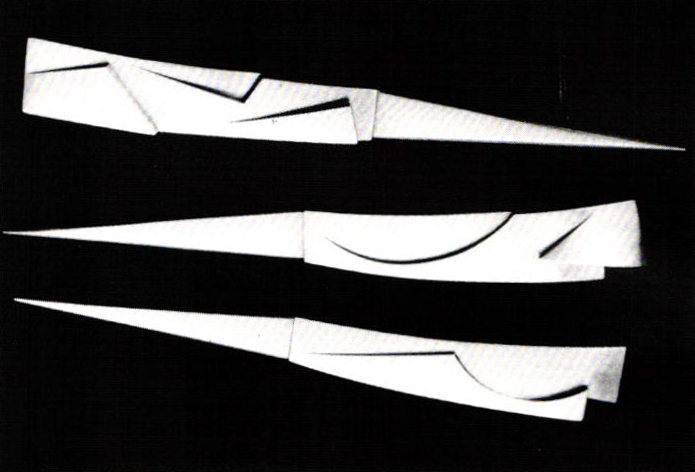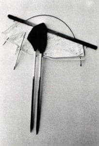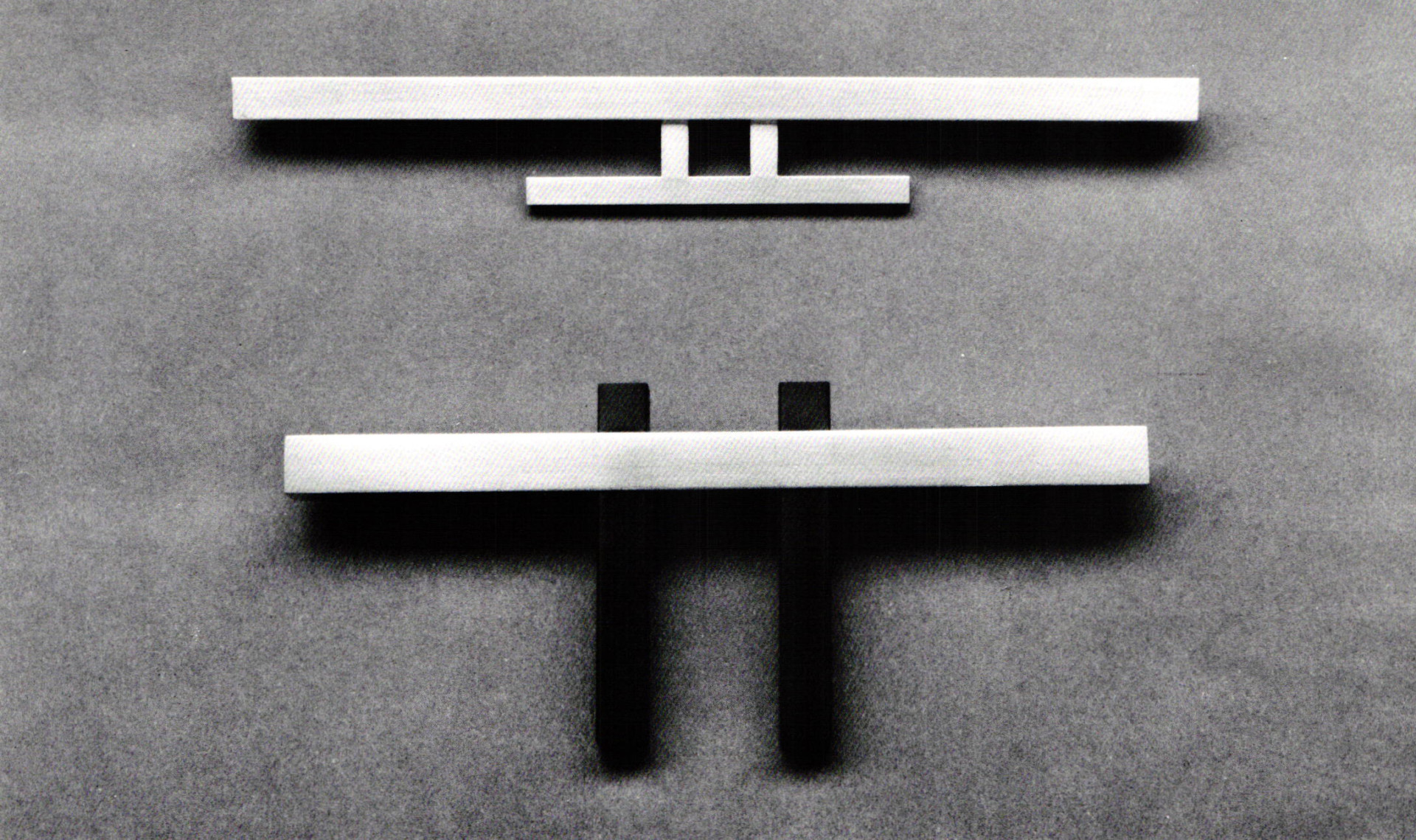 The jewelry is divided into live basic categories: brooches and earrings forged from a single, angularly bent wire (the simplest solution to creating three-dimensional, spatial enclosures out of two-dimensional line); three-dimensional bridgelike structures; tension pieces out of silver and stainless steel; "T"- formations made from silver and slate and ebony "hieroglyphs" based upon the details of the "T"-formations.