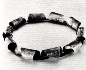 In their first reactionary step in the 1960s, the Dutch designers began to use nontraditional materials like aluminum, rubber and brass, meanwhile keeping to elementary techniques and "minimal usage for maximum effect." Today the movement maintains both its discipline of design and its challenge to the precept that the highest inherent value in jewelry is in the value of the materials over art, philosophy and individuation. The show includes collars of anodized aluminum or wood; bracelets of cleverly connected laminated foil candy wrapper squares; painted wooden shapes that attach and adorn uniquely; plus pieces created of rubberbands, corroded tin, plexiglass, cork and fabric-sheathed steel. There is silver and gold, but in unembarrassed apposition with less costly copper and tin.