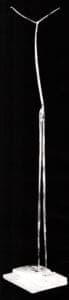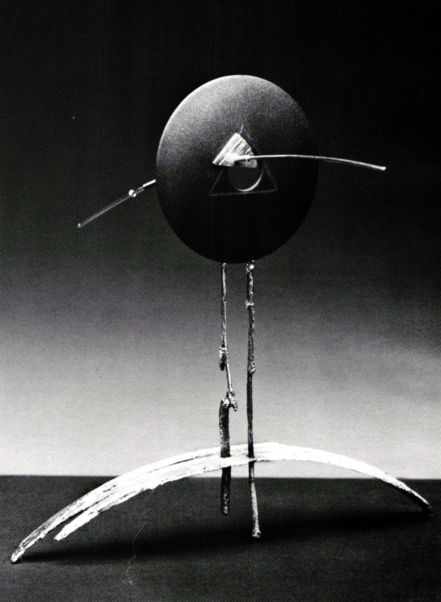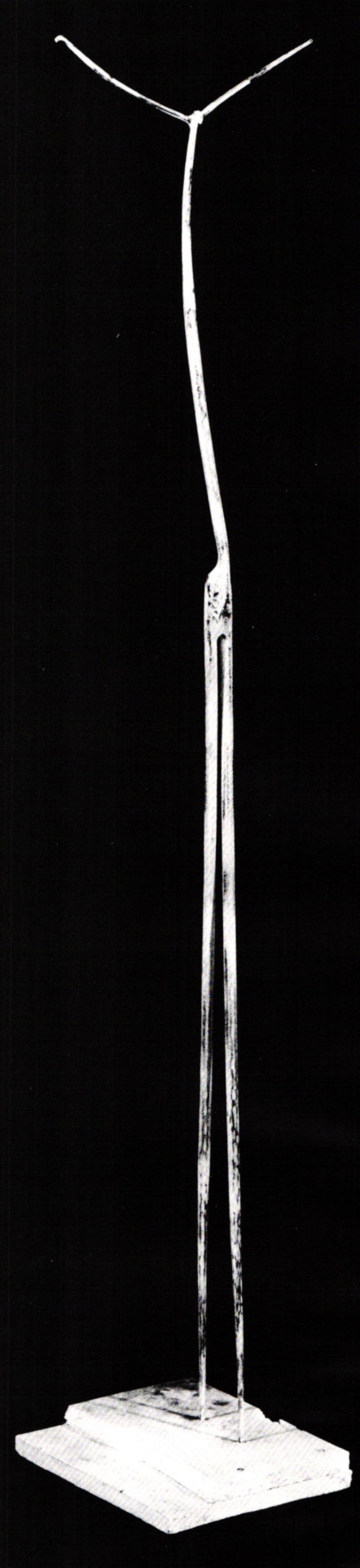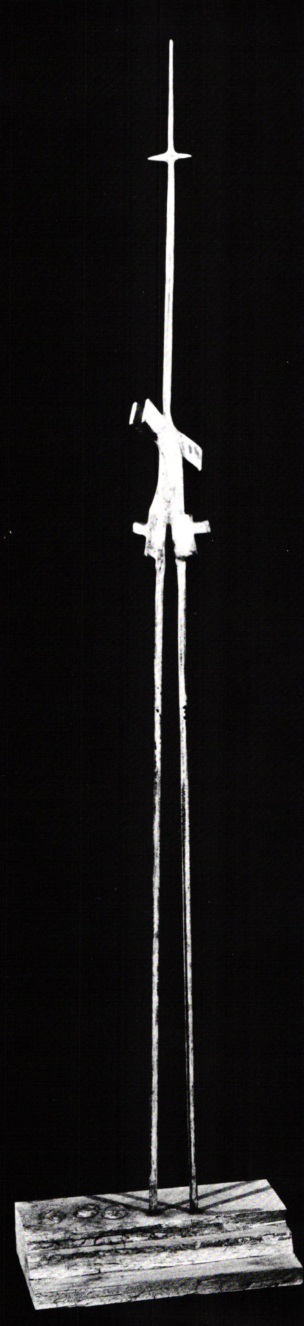 One is instantly struck by the shift from the characteristic horizontal and kinetic function, so dominant in previous work, to a distinct vertical orientation implying expressive strategies beyond purely formal consideration. These figures no longer demand interactive forces yet are insistently dynamic via optical tactics, as the handling of color allows gestured append ages to offer complex illusions of movement within static, volumetric spaces. Upon an initial encounter, a reductive, "Giacomettian" dimension characterizes much of the work. These appendages form subtle, cruciform shapes as legs cross the pelvic element where a stele pronounces the vertical. Rectangular flags, and collage patterns often adorn the form at its hips, where the primary material volume appears. In some cases, hip sections are expressed as the flared laws of blacksmithing tongs with reins, completing spindled legs, poised on a three-tiered base. The bases serve to further suggest ascension figures holding promise of levitation and magical spectulation.