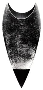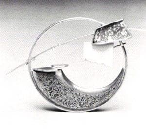For example, one brooch, Stonehenge, consists of two large angular and asymmetrical "U" shapes, the top "U" silver and the bottom purple-heart wood laminated together. Another is an elongated Urn made with a combination of mirror-finished, beveled silver that curves out into a crescent and angles down to a section of oxidized silver; polished to catch the light before it is laminated to an ebony tip. Also of silver and ebony, her large, magnificent Antelope Brooch, looks somewhat like a medieval crusader's banner. Finned Skeet, and Skeet Brooch, although their antecedent is the clay target used in trapshooting, carry allusions to Scandinavian ritual objects. Earrings take the shapes of Roman arches, flat fish and arrowheads. The one bracelet in the exhibit. Leaf Bracelet, is made entirely of silver and is a circle of ring-connected, overlapping leaves, which ingeniously popup when on the wrist.