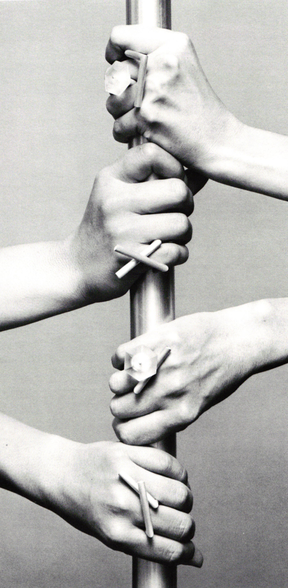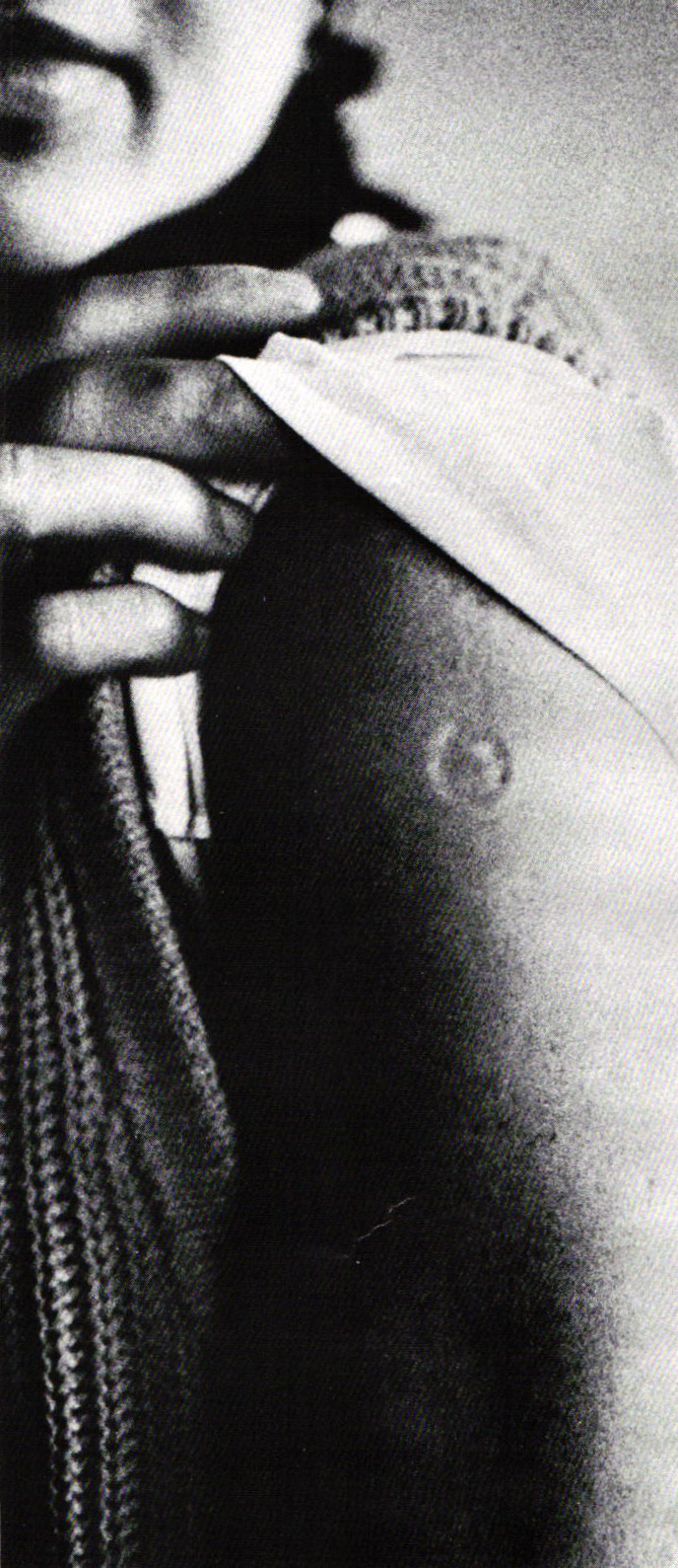 In Kevin Maginnis's Vaccination, a series of photographs show common people rolling up their sleeves to reveal their small pox vaccination scars. The scar symbolizes the belief in the power of science to heal, yet the work is not just informative, it can also be seen as a new approach to adornment. The scar, in this case, is the jewelry, just as Gijs Bakker's marring of the body with his "shadow and invisible jewelry" created a new format for embellishment (the imprint or indentation left by attaching a gold wire "bracelet" tightly around the arm).