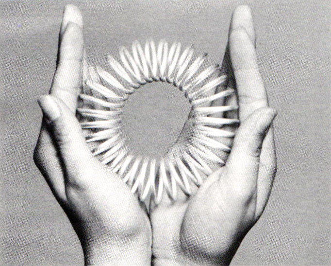 An altered sense of self in space results from wearing the thin, bent, oversized, dimensional necklaces of cotton-wrapped steel by Lia De Sain, Rian De Jong's wooden shoulder-stands also break through traditional perceptions of adornment, redefining the human form and the architectonics relating to it. There is romance in the delicate three-dimensional necklaces of spirals elaborated in tin, gold or silver and looped together in arabesques by Coen Mulder, Humor underlies paper bracelets and necklaces by Beppe Kessler. Their synergistic charm is enhanced by the materials used (Playboy and The Financial Times).