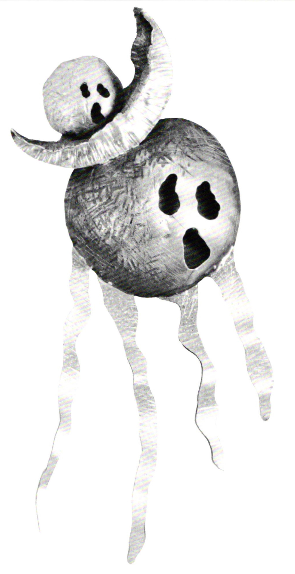 Memento Mori is Lewis's attempt to exorcise the grief he feels from his involvement with AIDS patients. With its carved bone skulls and stressed gold and silver forms, it presents a harsh and morbid image—a monument to death. A somewhat lighter message is represented in Critter, a small but powerful creature conveying aggressiveness and fury within the context of fantasy. In a similar mode, Desolate Moon with Small Companions communicates melancholy sadness and loneliness. Even with companions all around, the piece suggests we are still alone. It holds a secret surprise for the wearer in the additional companions hidden on the back, but even these are lonely—such is the human condition.