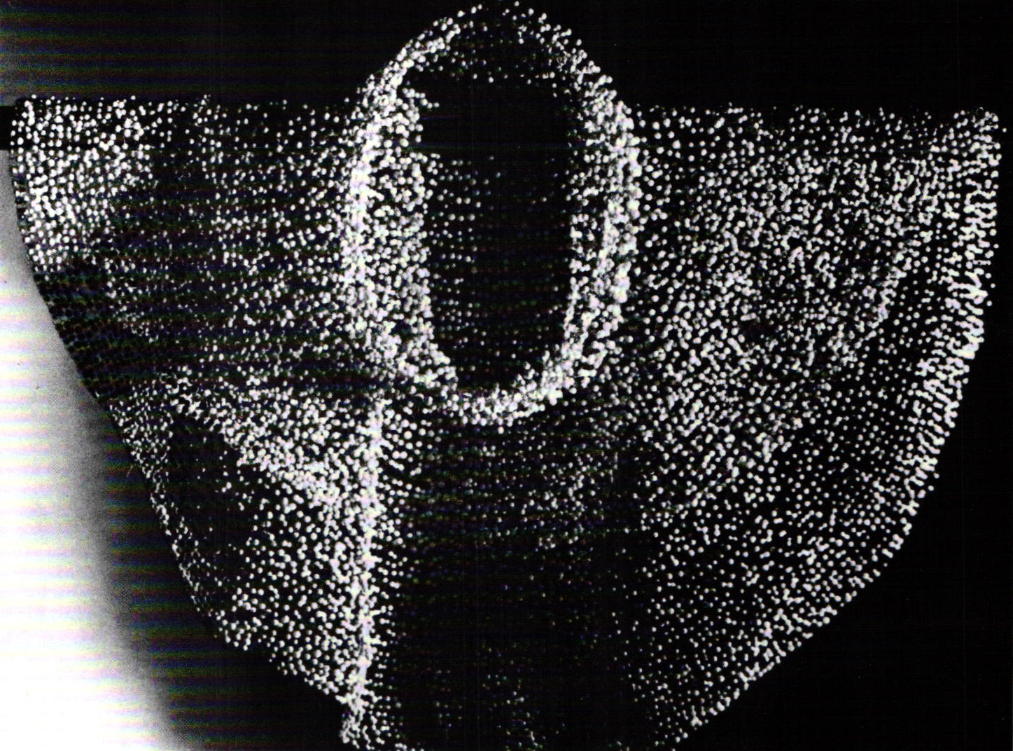 Weighty materials like metal beads and wire are used in Three Bonnets, a piece whose construction suggests monumental sculpture. In Head Piece (#6), torn fragments from comic strips are reassembled into a beehivelike object. Upon close inspection, snippets of Mickey Mouse images are discernible. The piece is typical of many works whose cumulative effect masks the identity of its components. Sieber-Fuchs is sensitive to the expressive possibilities of structure, and her art has visual affinities to the works of architects Frei Otto and Felix Candela.
