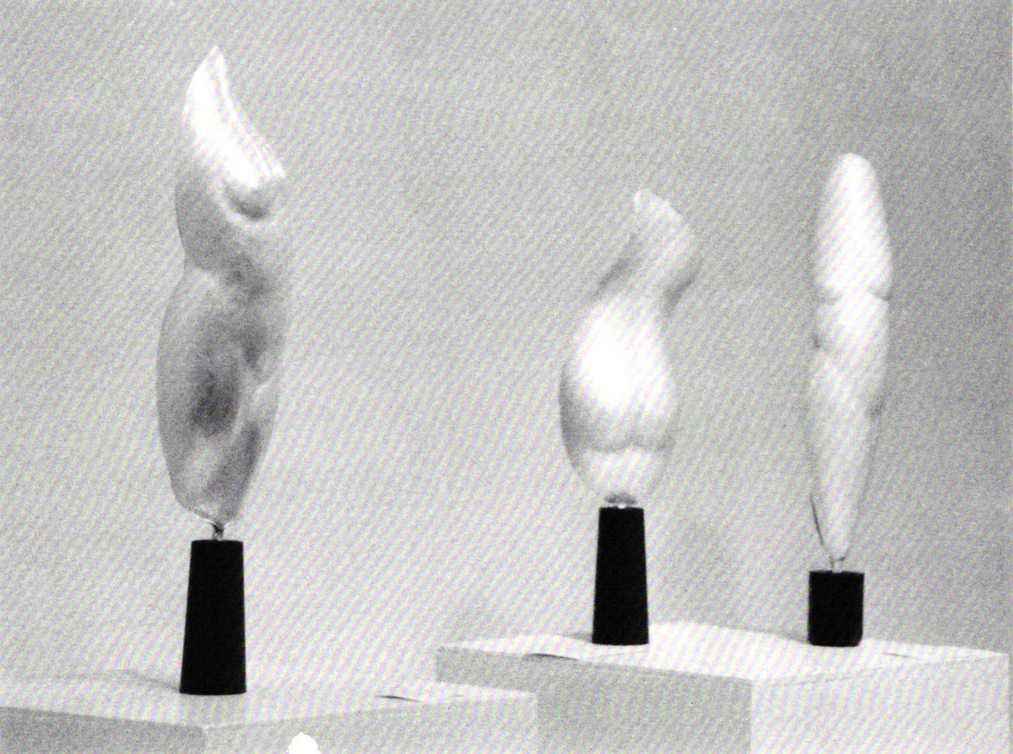 David Butler provided iron altar stands for his folded metal forms, lending them a stately appearance. Lynne Hull emphasized hard, symmetrical and crisp-edged rotation forms. Shari Mendelson's forms were organic, with richly involved surfaces. Claire Sanford's forms were essentially cylindrical, fashioned from strips and bands of patinated metal. This open weave approach stretched the "vessel" concept to more basket than vessel. Pamela Lins crossed into sculpture since her vessel forms were attached to other components, some of them figurative.