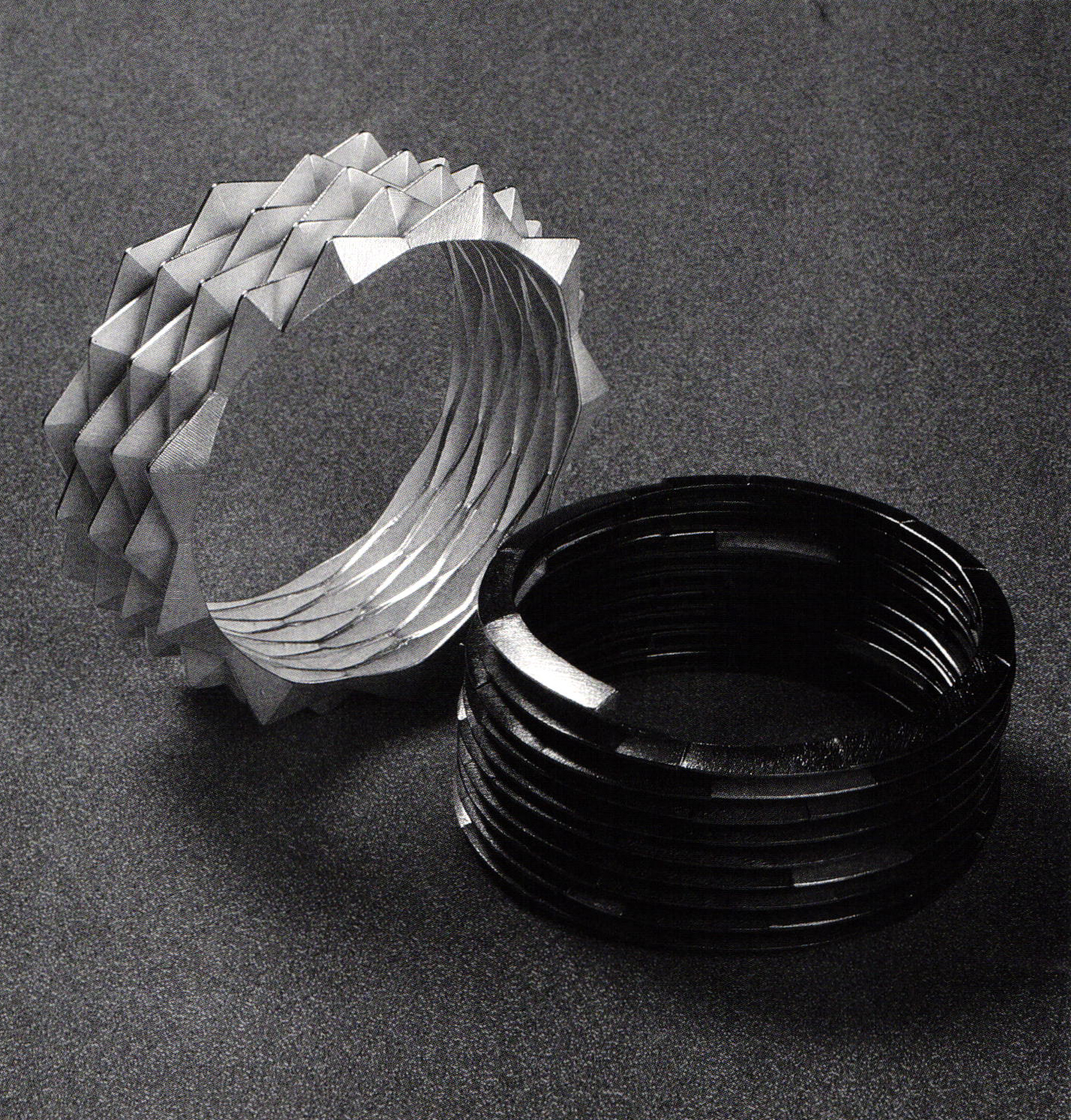 By focusing primarily on the modular aspect of the coil pieces, Quigley generated another impressive series of bracelets called, variously, Starburst, Sunburst and Pineapple. Here, hollow pyramidal units were soldered into bracelet-sized rings to form a kind of open star form. These spiky rings were then stacked to form a regularly staggered surface. As in the coil bracelets, Quigley sporadically inserts a different [color] metal unit while soldering the rings. She also blankets the surface with a subtle "veil' of hand-Florentining.