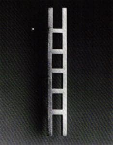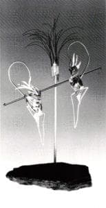 Jennifer Swartz's earrings, Desparation, while far-out in design, somehow worked. Each earring consisted of a Lilliputian sculpted man seated on a bar and reaching up. Hanging below each figure was a tiny photo of a diminishing road. I don't know how wearable they might be, but they were intriguing as miniature sculptures and I admired them. This is more than I can say about a few of the other outre earrings that I frankly could not see anyone wearing for either personal enhancement or chic. I have strong feelings about jewelry and feel that gimmickry — no matter how clever — is apt to be a poor idea.